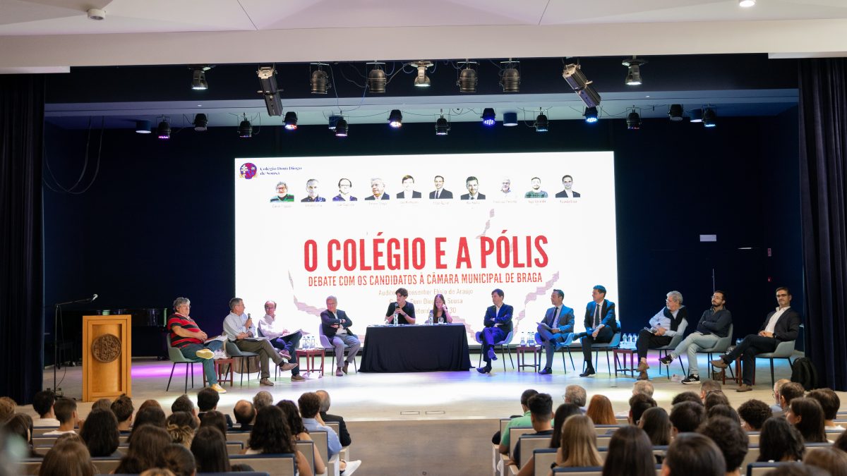 Outubro 2, 2025No dia 29 de setembro, realizou-se, no âmbito das atividades previstas no PAA do Departamento de Ciências Sociais e Humanas e EMRC, um debate intitulado “O Colégio e a Pólis”, no auditório Monsenhor Elísio de Araújo, e que contou com a presença dos dez candidatos à Câmara Municipal de Braga, nomeadamente João Rodrigues (PPD/PSD, CDS-PP, PPM), António Braga (PS, PAN), João Baptista (PCP-PEV), Filipe Aguiar (CH), António Lima (BE), Rui Rocha (IL), Carlos Fragoso (L), Francisco Pimentel Torres (ADN), Hugo Varanda (MPT), e Ricardo Silva (Independente). O debate foi promovido e moderado pelos alunos do 12.º ano das disciplinas de Geografia C e de Educação Moral e Religiosa Católica, em articulação com os temas de Cidadania e Desenvolvimento, designadamente “Instituições e
